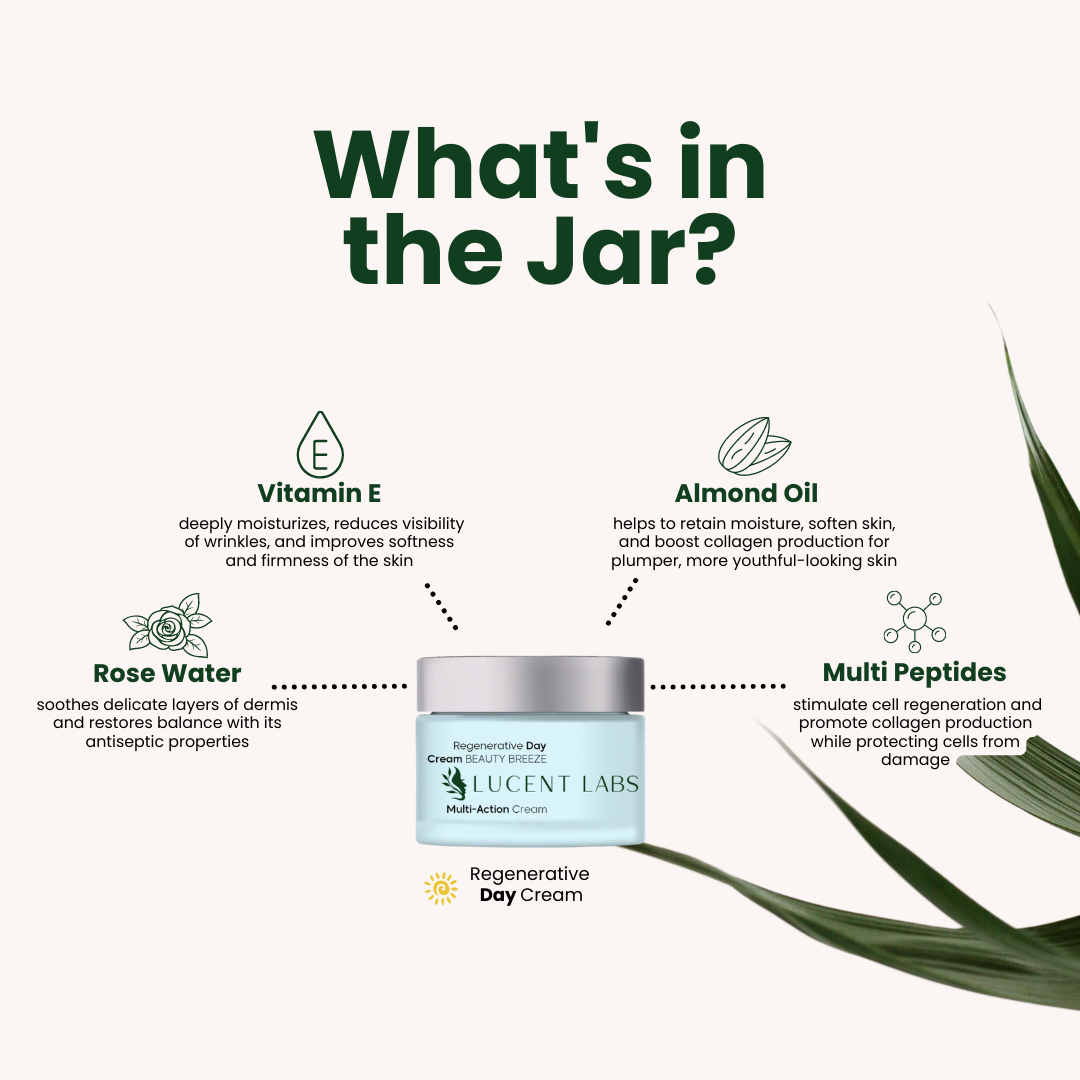 Looking for a cream that can help reduce the signs of aging? Regenerative Day Cream from BEAUTY BREEZE is an advanced formula containing powerful key ingredients like Vitamin E, Almond Oil, Multi Peptides, and Rose Water. These ingredients work together to activate a regenerative process in your skin, helping you look younger and more vibrant.
