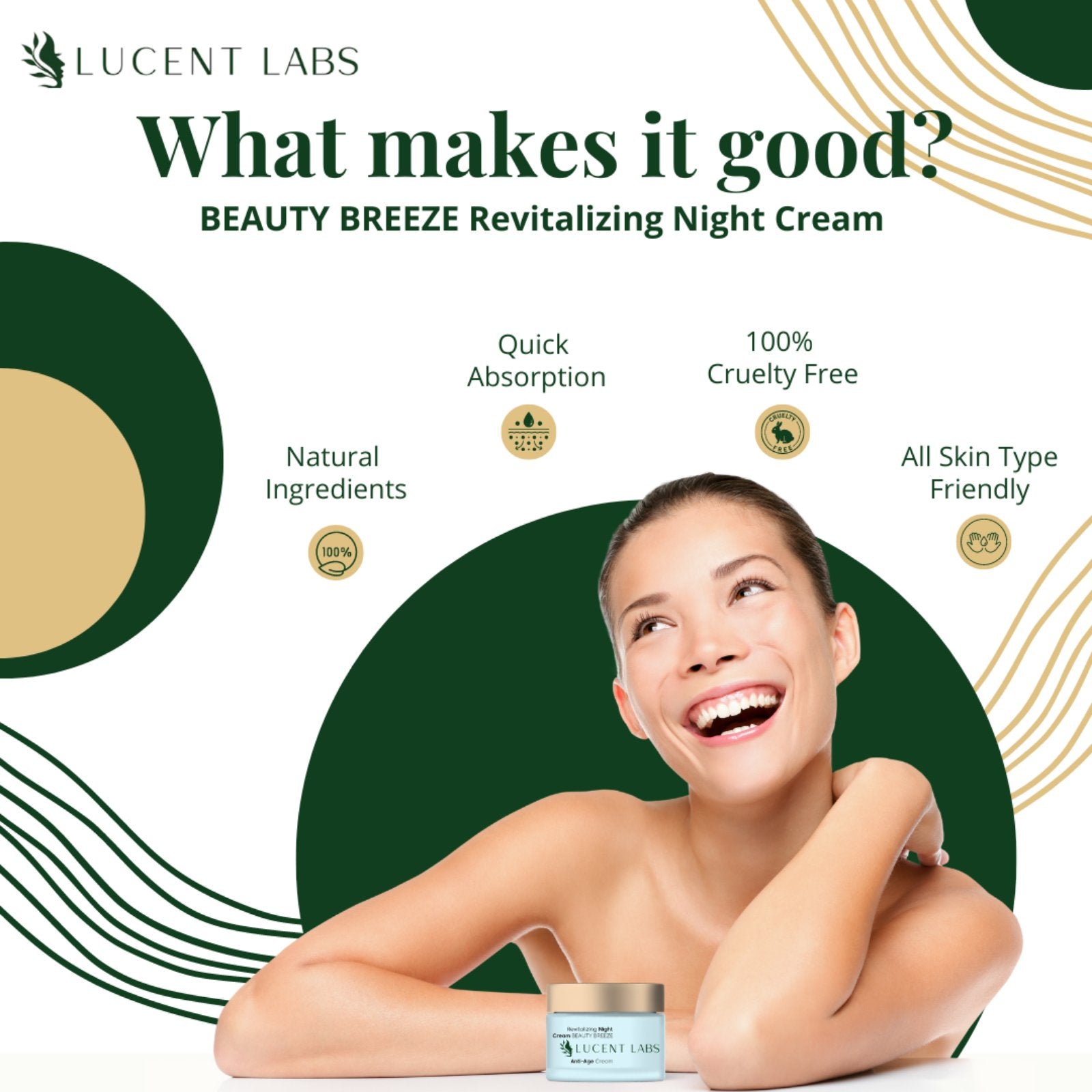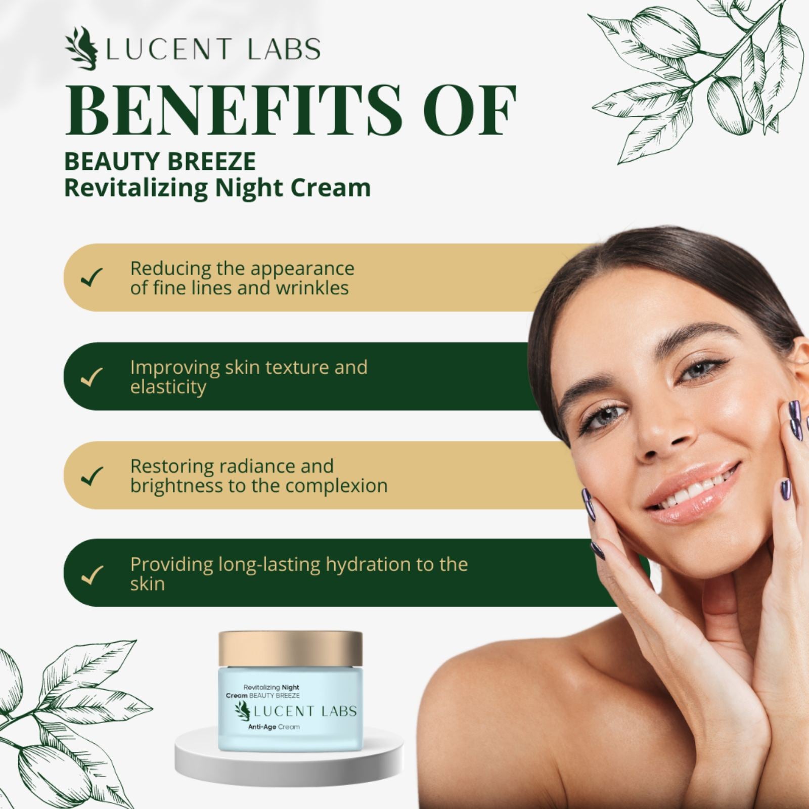 Beauty Breeze Revitalizing Night Cream is an innovative anti-aging formula designed to reduce wrinkles and nourish the skin for a radiant, youthful complexion. This rich cream contains a blend of powerful yet gentle ingredients, including multi peptides, jojoba oil, tocopheryl acetate, and almond oil, to effectively treat aging skin.